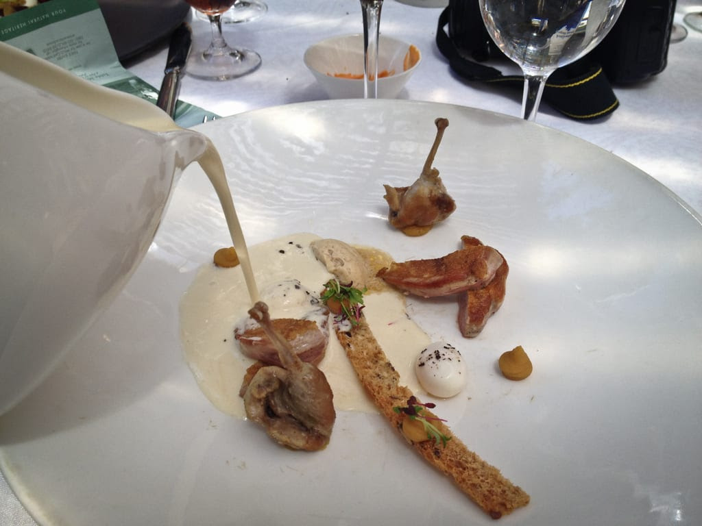 Course one: quail velouté. A fantastic creamy soup with bits of quail legs and quail eggs as well as pieces of flavorful pork.